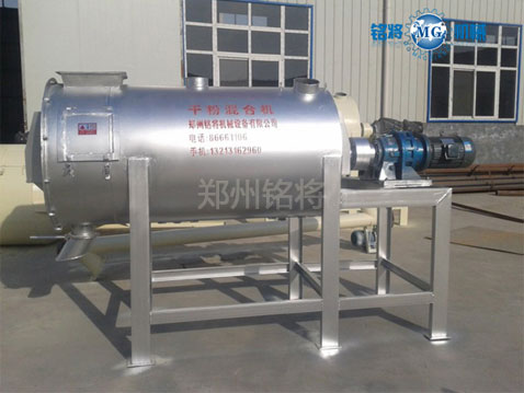 各種組分的物料按配方比例經(jīng)過(guò)計(jì)量后進(jìn)入混合機(jī),物料在帶狀螺旋葉片的推動(dòng)下進(jìn)行混合。外螺帶將物料從一端推動(dòng),內(nèi)螺帶則使物料向相反的方向運(yùn)動(dòng),里層物料被推到一側(cè)后由里向外翻滾,外層物料被推到另一側(cè)后向里翻滾。物料在對(duì)流過(guò)程中二股物流相互滲透、變位而進(jìn)行混合,在兩側(cè)翻滾過(guò)程中在進(jìn)行混合,這樣反復(fù)進(jìn)行多次,然后通過(guò)出料控制機(jī)構(gòu)將混合均勻后的物料從卸料門(mén)卸出。